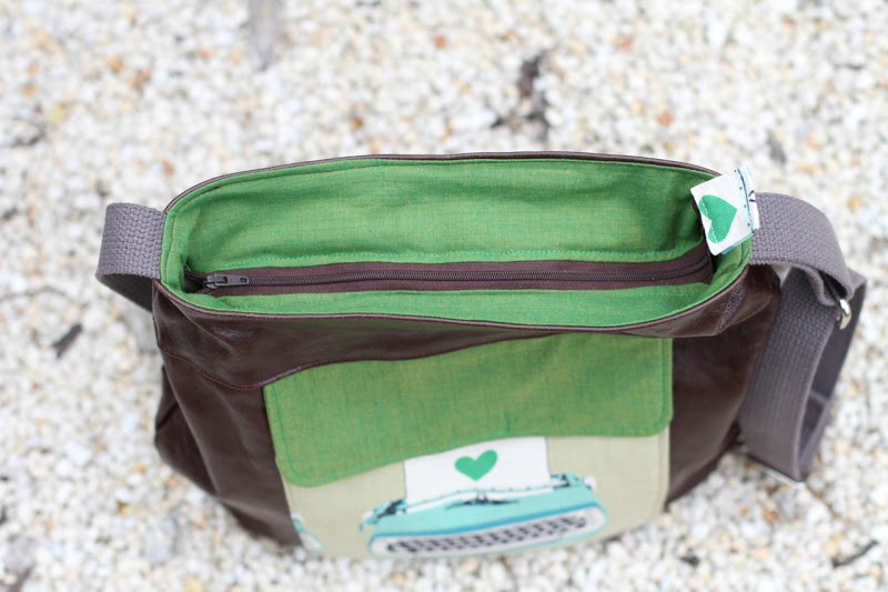 The thing that really won me over with the bag pattern is the recessed zipper top. AWESOME! Now I can throw my bag around and not worry about things falling out or the kids getting into things too easily. I used a shot cotton for the solid green fabric. Because shot cotton is a little thinner than regular cotton, I used two layers to give it extra strength and stability. I was going to use the typewriter fabric for the handle, but the print was too large and messy, so I was happy to find this brown bag handle webbing in my stash and used that instead. Strong and practical – I wish it was slightly darker, but am still happy with it.