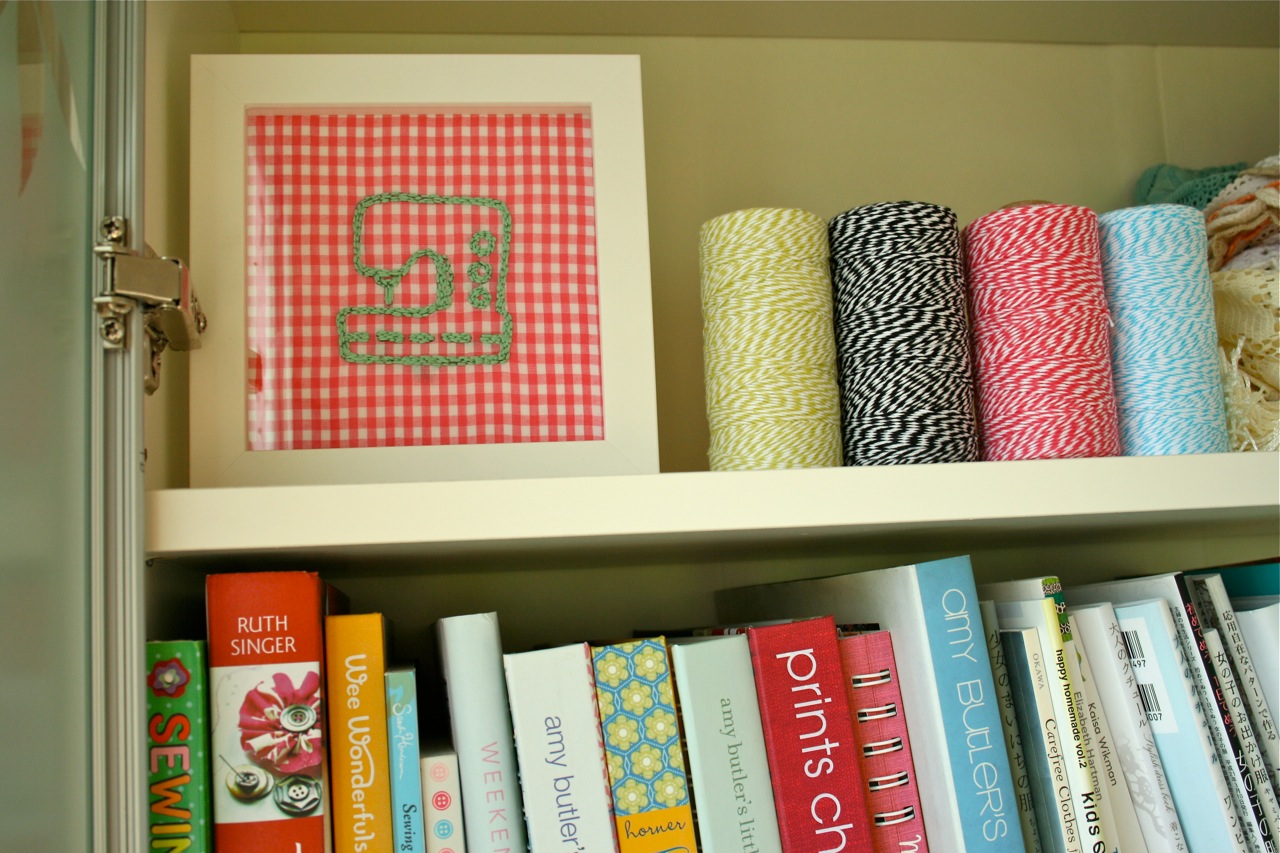 My non-sewing sister embroidered the funky sewing machine for me. Love it! And I think every crafty person needs a spool or two of bakers twine, right?!