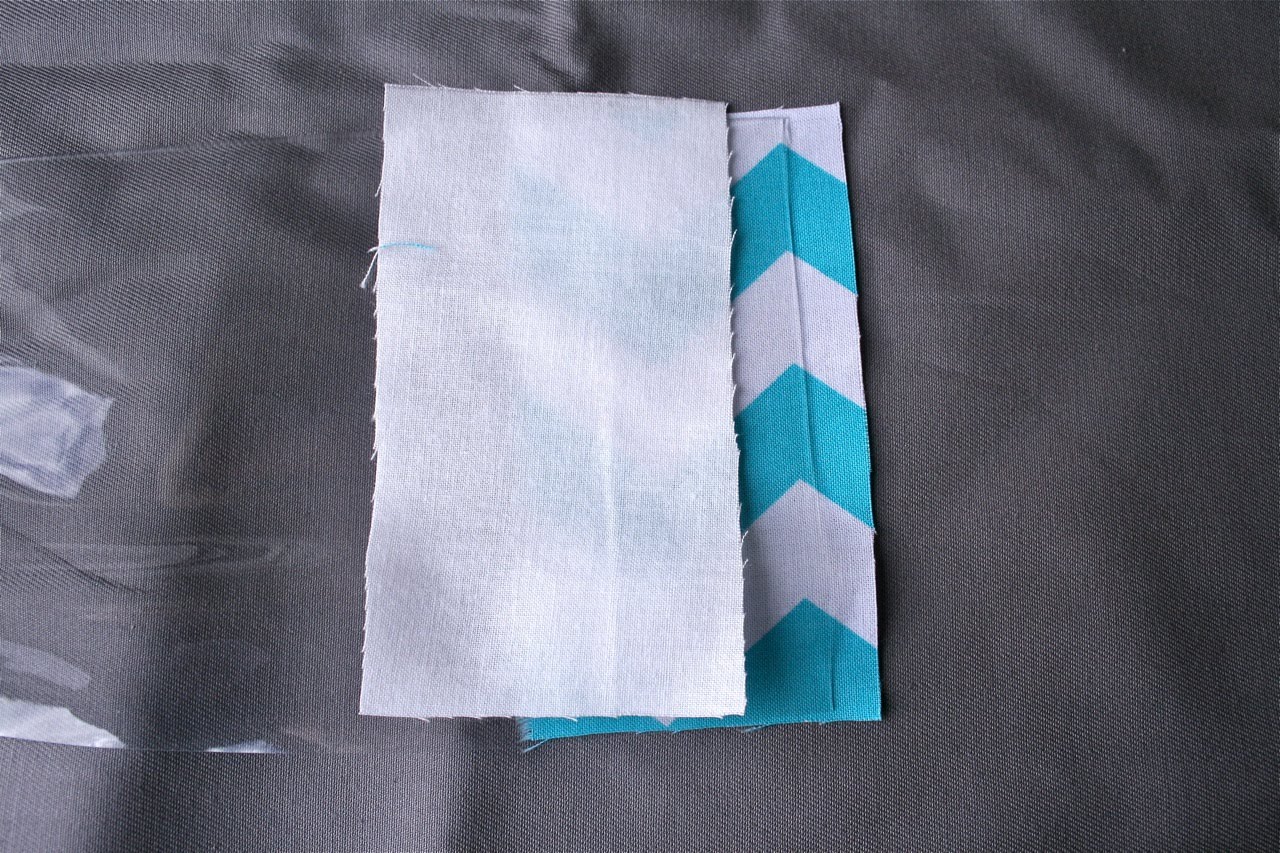 Step 1. Take one of the 4 1/2″ x 2 1/2″ rectangles of fabric cut from exterior and lay on the table with right side facing up. Take your rectangle cut from plastic sheet and lay on top of exterior fabric, matching up short edge of plastic strip with long edge of exterior fabric. Take one of the 4 1/2″ x 2 1/2″ rectangles of fabric cut from lining and lay on top of the plastic sheet with right side facing down. Match up raw edges (the plastic sheet should be sandwiched between the exterior and lining fabrics). Using pins on the plastic sheet will make holes, to hold in place, use a few paper clips along the raw edge. Sew together along paper clipped edge, using 1/4″ seam. Repeat to attach other 4 1/2″ x 2 1/2″ rectangles of fabric cut from exterior and lining on the opposite short edge of plastic sheet. Fold fabric out so that wrong sides are touching. You can’t iron near the plastic sheet, so firmly press seams flat with your fingertips. Step 2. Take the 2 1/2″ x 12 1/2″ rectangles of fabric cut from exterior and lining and attach to the bottom long edge of the plastic sheet and side pieces of fabric in the same way you attached the side pieces. Match up raw edges and pin or paper clip into place. You can use pins where you are joining fabric to fabric.