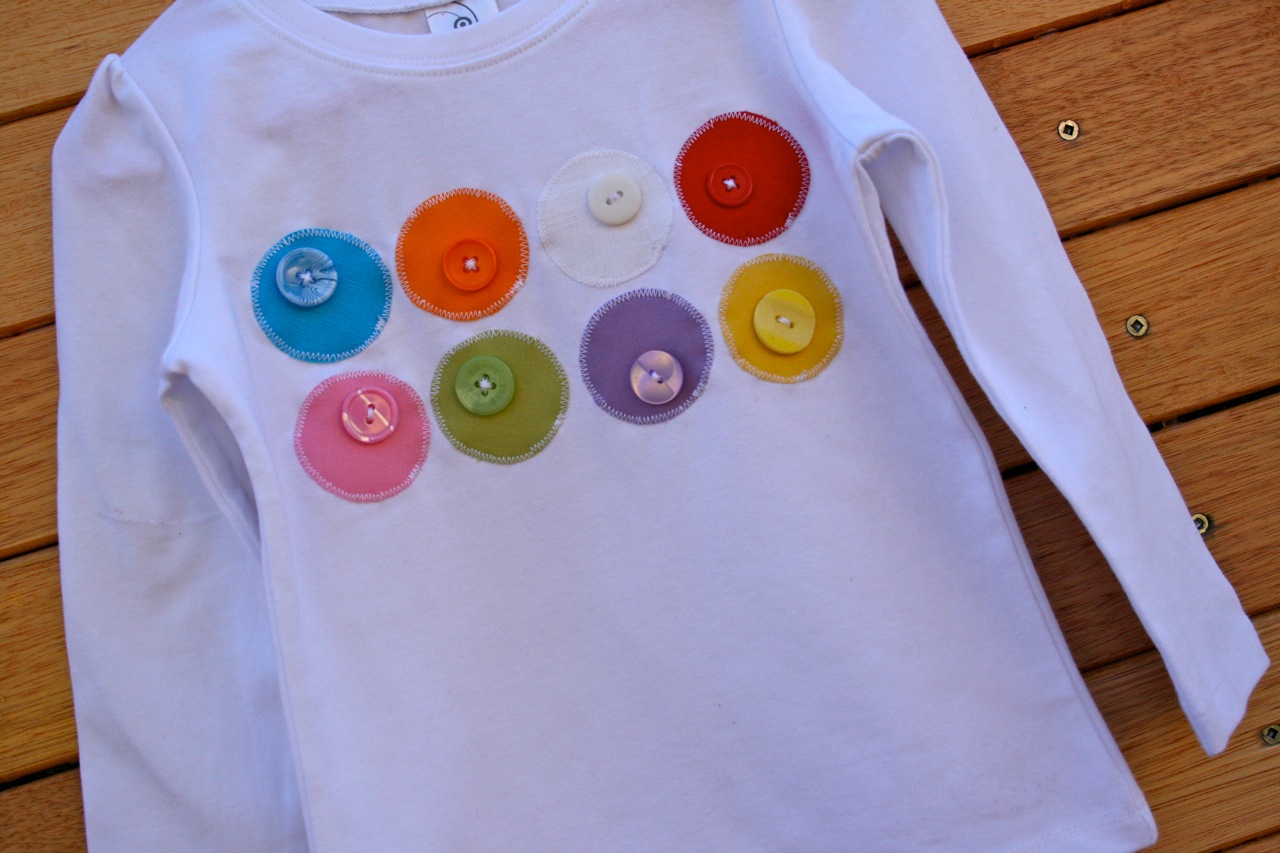 I was browsing Flickr one night and was inspired by this cute top. I thought I could do something similar with some circles and hand stitching. When I started digging through my scraps though, I ended up choosing a heap of solid colours and loved the way they looked together. I played around with having the buttons sitting on different colours and it looked really funky but decided to go for a more subtle approach with the buttons hiding on similar coloured circles.