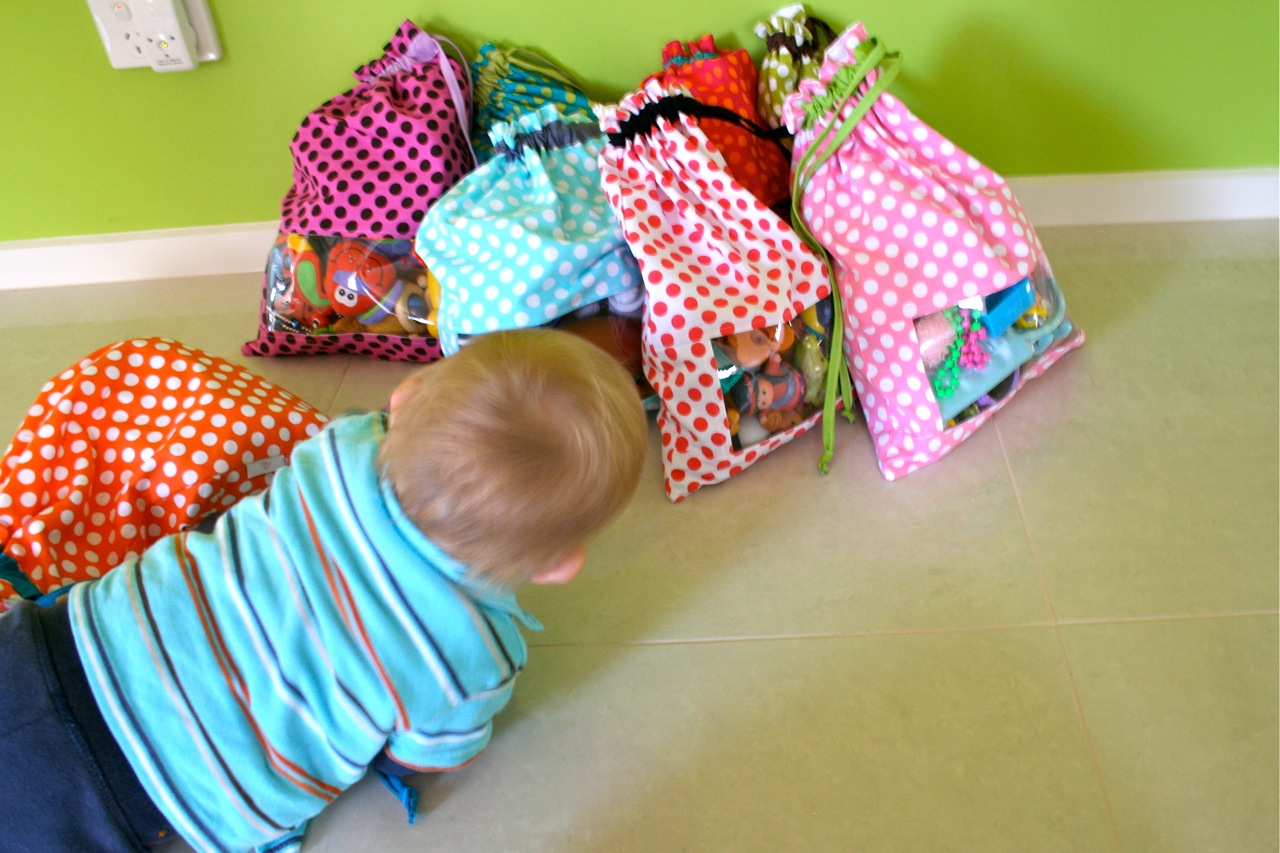 I know this won’t solve the dilemma of having all of the toys dumped onto the floor, but I like a bit of toy organisation and it may aswell look good! We have to clean up anyway and it is actually easier to get the kids to help if they have responsibility for picking up a certain toy…now I can give Oscar the car bag and he can be in charge of packing up all the cars and Lil can have the animals bag and pick up all the animals, etc. It makes the job seem easier and I can still hurry around and clean up the rest of the toys while still giving them a bit of responsibility.