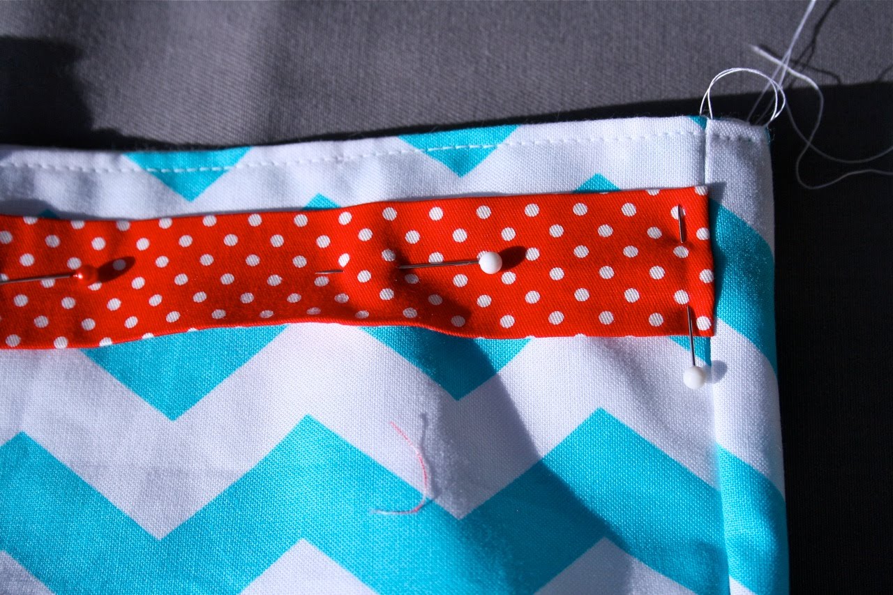 Set thin drawstring strip aside for now. Step 5. Take thicker strip for casing and fold one short raw edge under about 1/2″. Press. Align folded edge of strip with side seam of sack. Position strip so that it is sitting about 1/2″ from top edge of sack and pin into place. Continue pinning until strip has made it’s way around the entire sack.