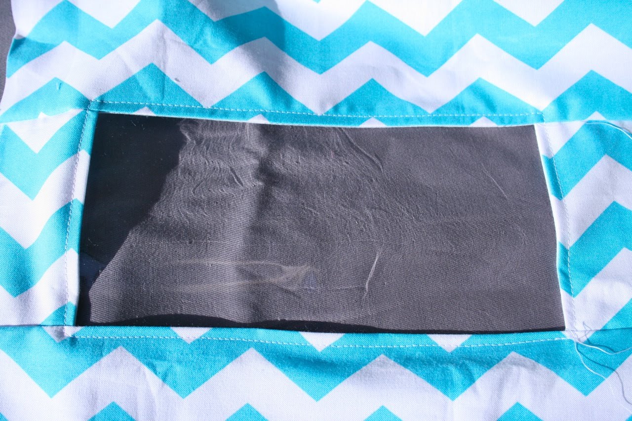 One 10 3/4″ x 12 1/2″ rectangle of fabric cut from exterior and lining for front of bag One 2 1/2″ x 12 1/2″ rectangle of fabric cut from exterior and lining for front of bag Two 4 1/2″ x 2 1/2″ rectangles of fabric cut from exterior and lining for front of bag One 16 3/4″ x 12 1/2″ rectangle of fabric cut from exterior and lining for back of bag One 4 1/2″ x 8 1/2″ rectangle cut from tablecloth plastic for window One 1 1/2″ x width of the fabric (40″-44″) strip cut from contrast fabric for drawstring One 2″ x width of the fabric (40″-44″) strip cut from contrast fabric for casing
