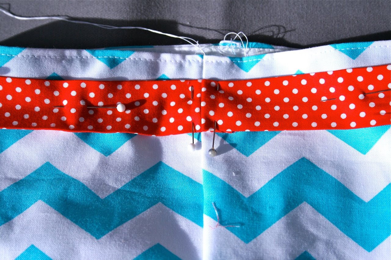 When you get back to the side seam you started at, trim the strip so that it overlaps the beginning of the strip about 1/2″, then fold short raw edge of the end of the strip under 1/2″ and align folded edge with the side seam of the sack. There should be an opening between the two folded ends of the strip, this is where you will insert your drawstring. Pin into place.