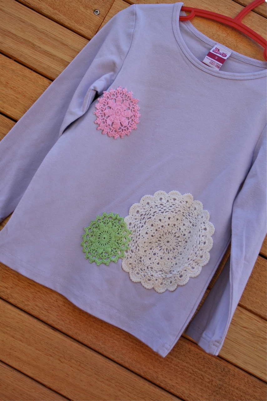 It was only a matter of time before I sewed some of my doilies onto a top for Lil. I love how it turned out. The white doily was sewn on with the sewing machine but the pink and green ones were a little too “lacy” to hide the stitches so I hand sewed those down. Do you think I could get away with a top like this for myself?!!