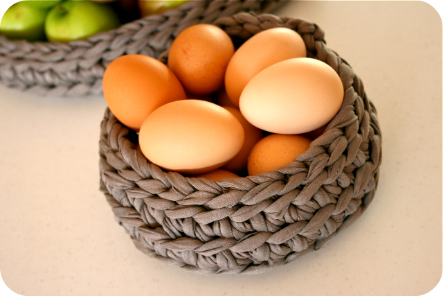 I had a bit of yarn left over so started on a second bowl, it ended up a decent size and at the moment is housing eggs!