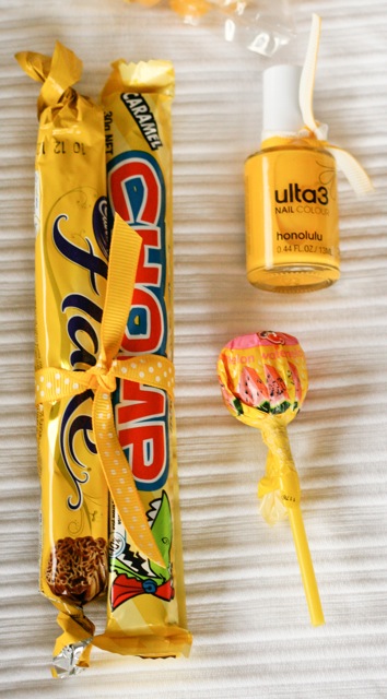 A box fully of sunny goodness to brighten up her day and give her something to munch while the waiting game begins- and I reckon she should paint her toe nails bright yellow ready for the big day 🙂