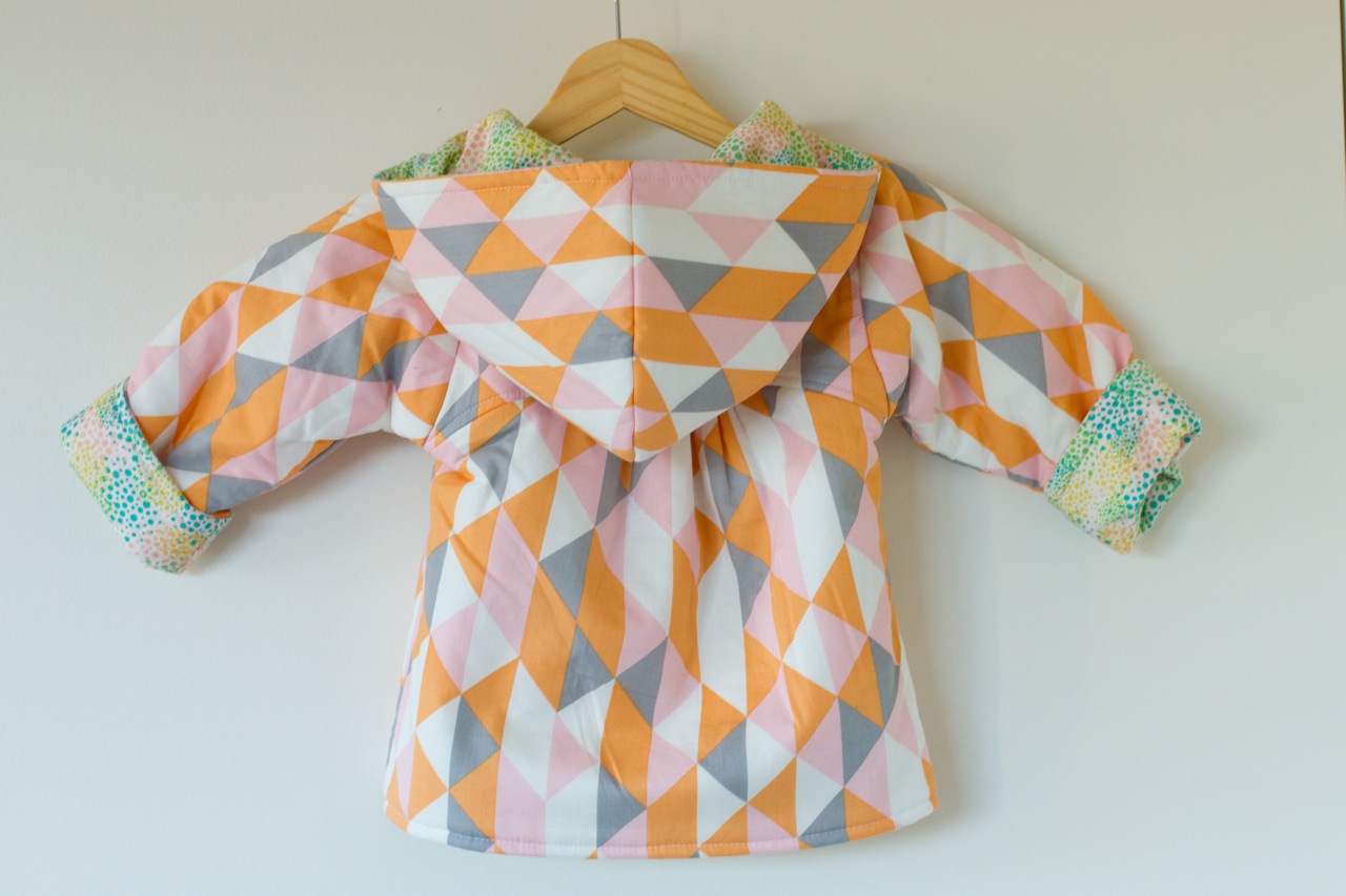This jacket is made using quilting cotton for both layers with some left-over quilt batting in between for snuggly warmth.